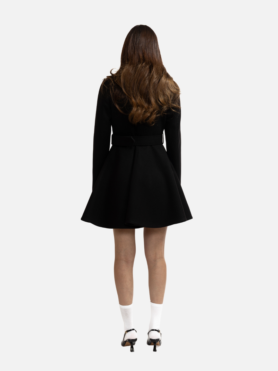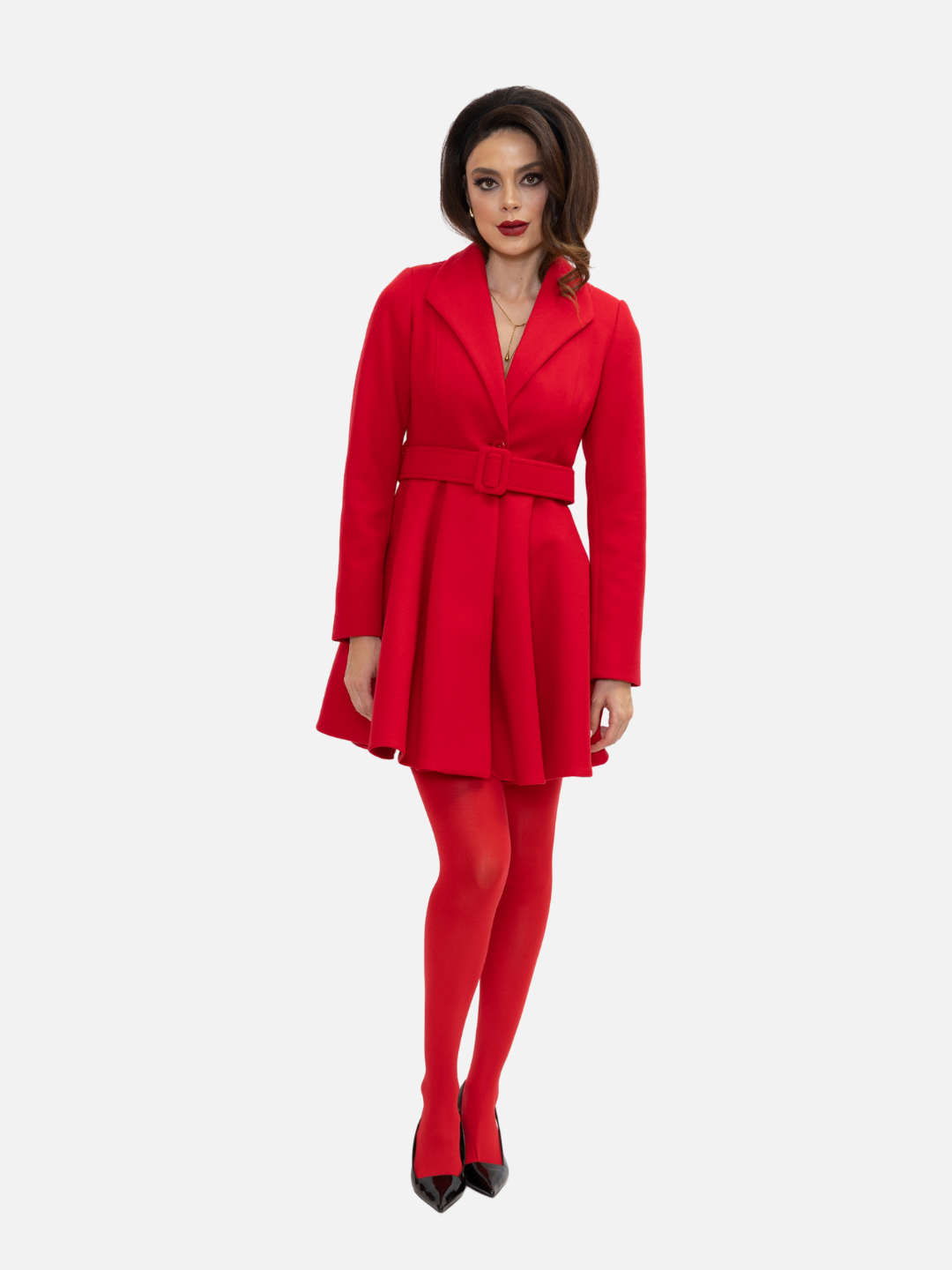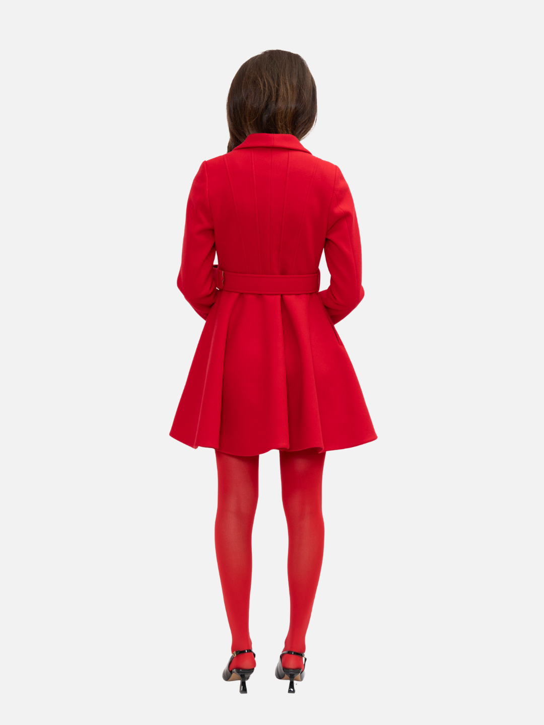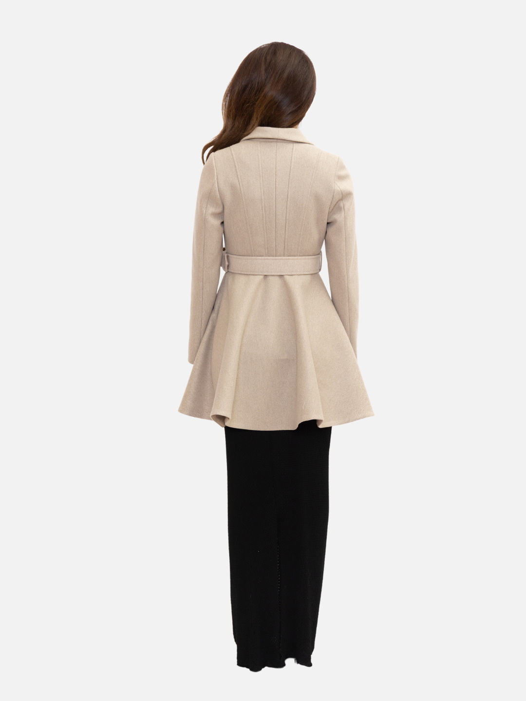 Abrigo con silueta acampanada confeccionado con estructura sastre y cuello de solapa clásica. Incluye cinturón ajustable que realza la cintura y un faldón con vuelo que aporta movimiento y feminidad. Un diseño elegante y versátil que combina sofisticación y carácter en cada detalle.
